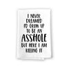 Add a little bit of sophistication to your home with our simple yet elegantly chic styled Honey Dew Gifts "I Never Dreamed I’d Grow Up to be an Asshole", 100% Cotton, Multi-Purpose Kitchen Dish Towel. Beautifully crafted from 100% cotton that's woven in the traditional diagonal pattern ensure durability and built to last. Your guests are sure to notice this little addition to your home. It also makes a perfect gift for your family and friends.