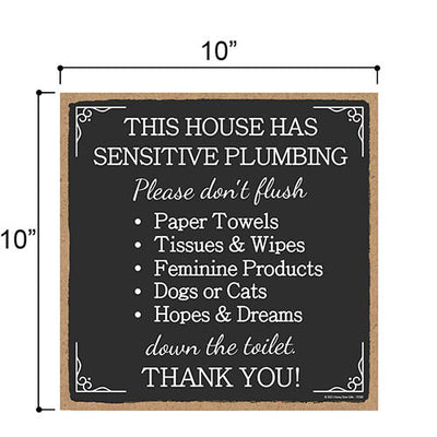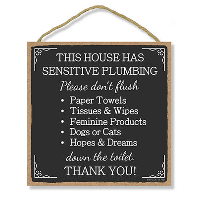 Add a little bit of sophistication to your home with our simple yet elegantly chic styled Honey Dew Gifts Wall Hanging Decorative Wood Sign - "This House Has Sensitive Plumbing" Home Decor. Your guests are sure to notice this little addition to your home or office.