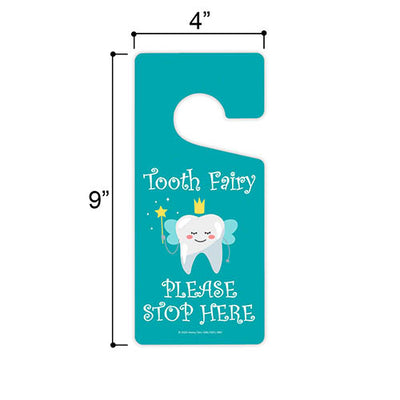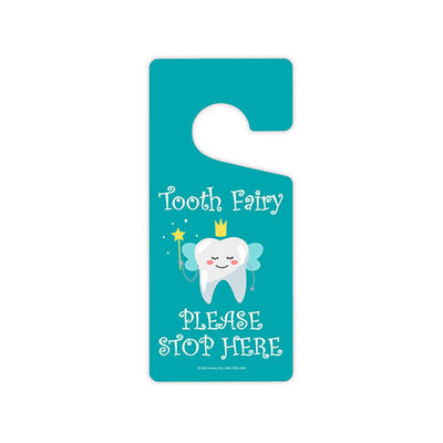 The Honey Dew Gifts "Tooth Fairy Please Stop Here" door hanger is a charming 4x9-inch aluminum sign that adds a magical touch to kids' room decor, ensuring the tooth fairy never misses a visit while sparking imagination and joy in your child's space.